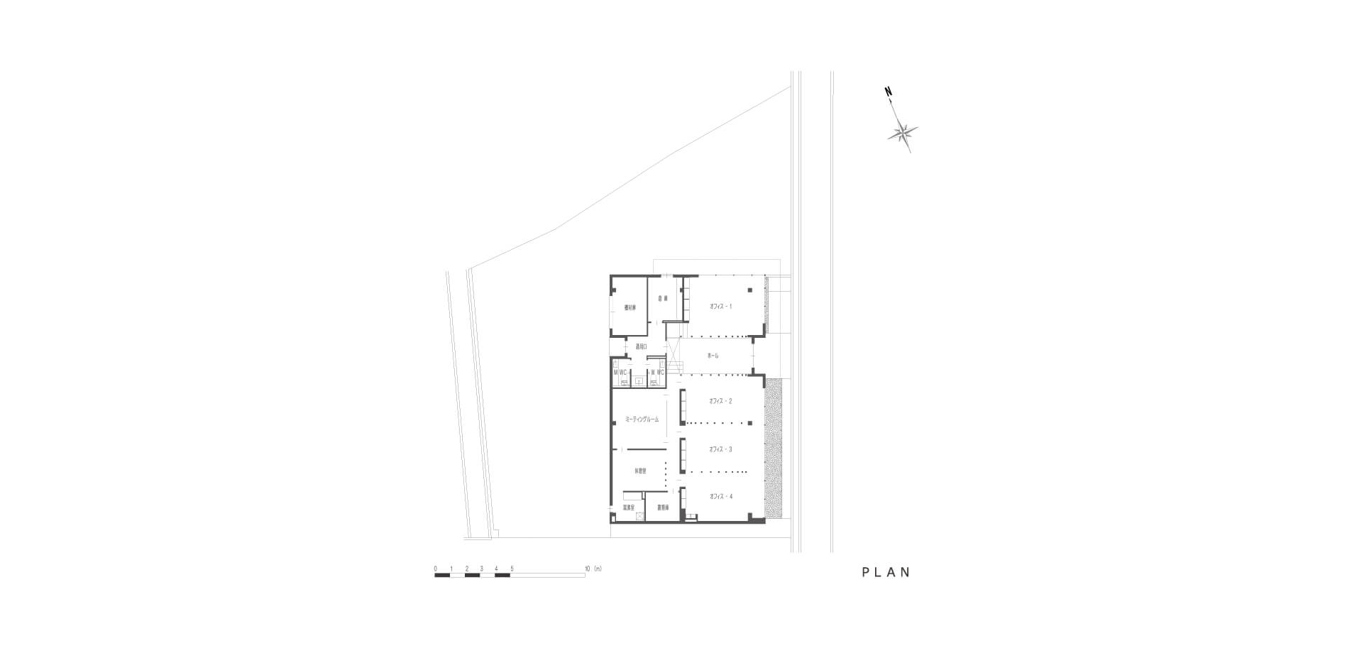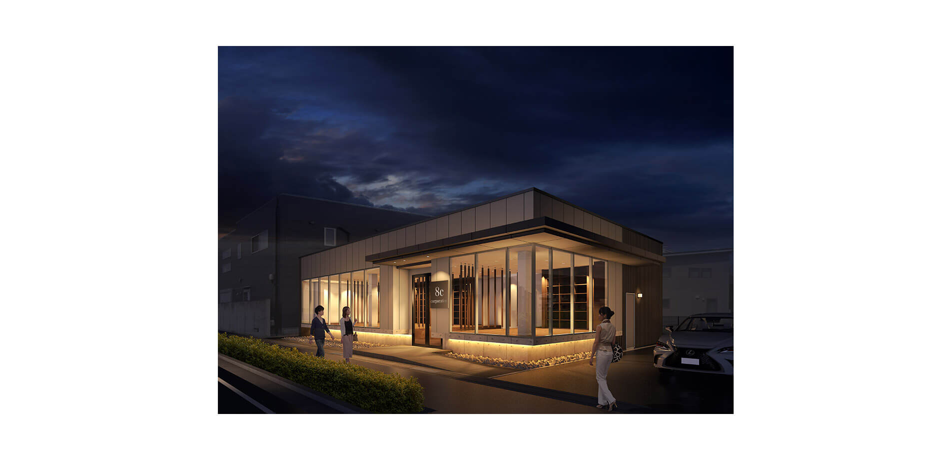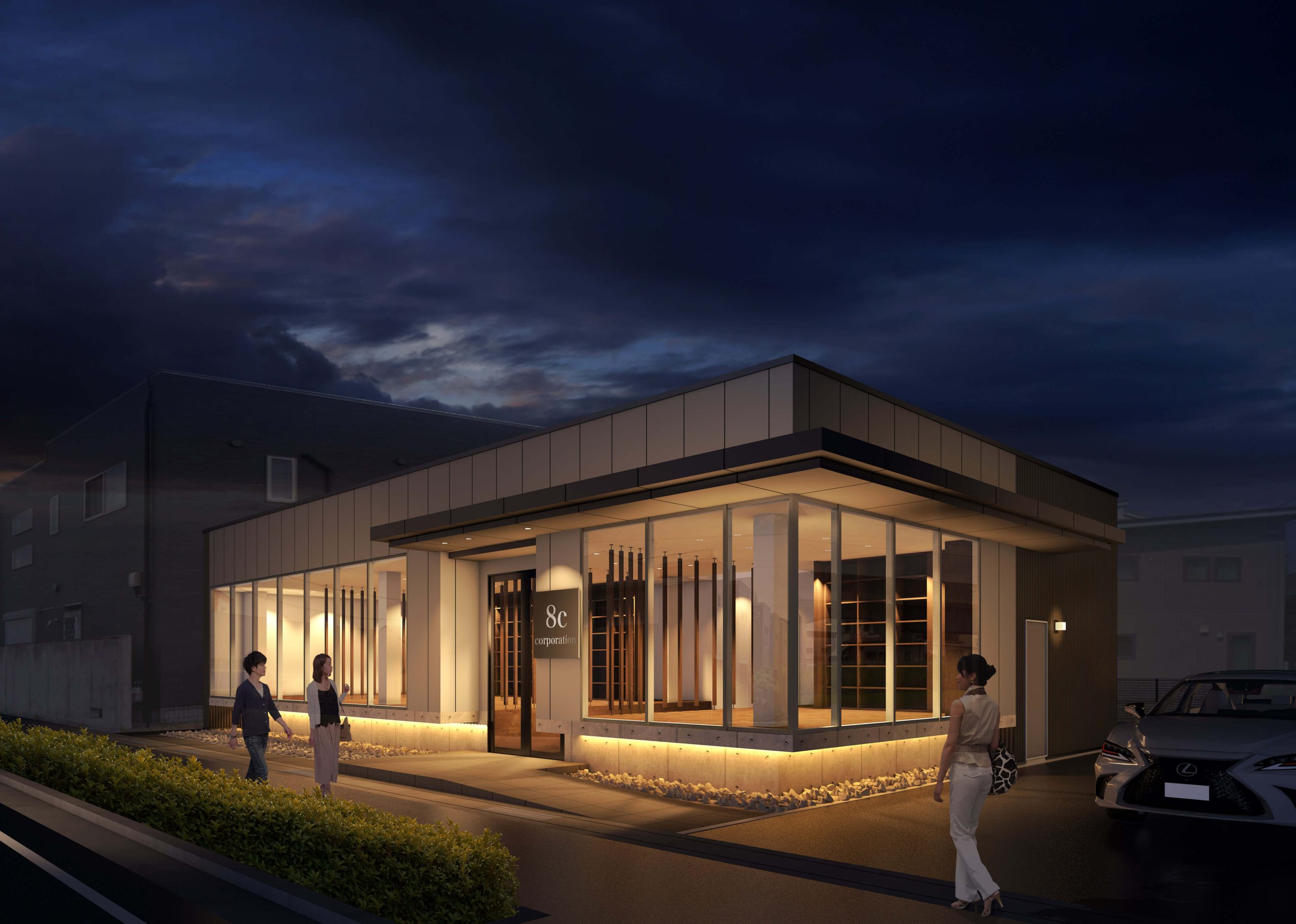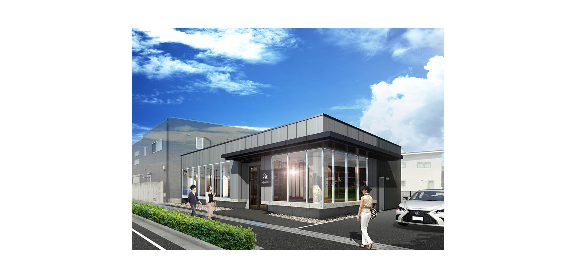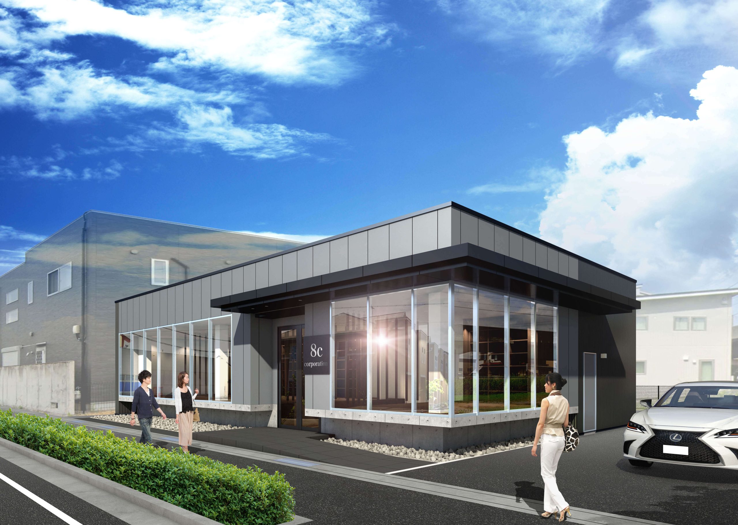 視覚的に事業所スペースを幹線道路から見てフロートするイメージの外観で計画しています。