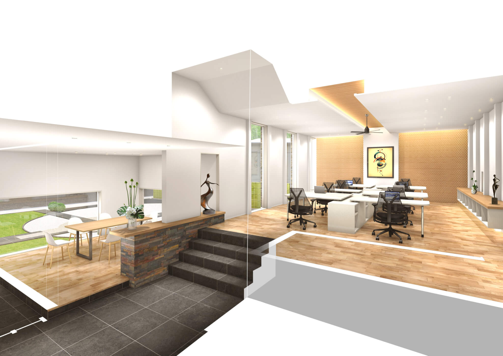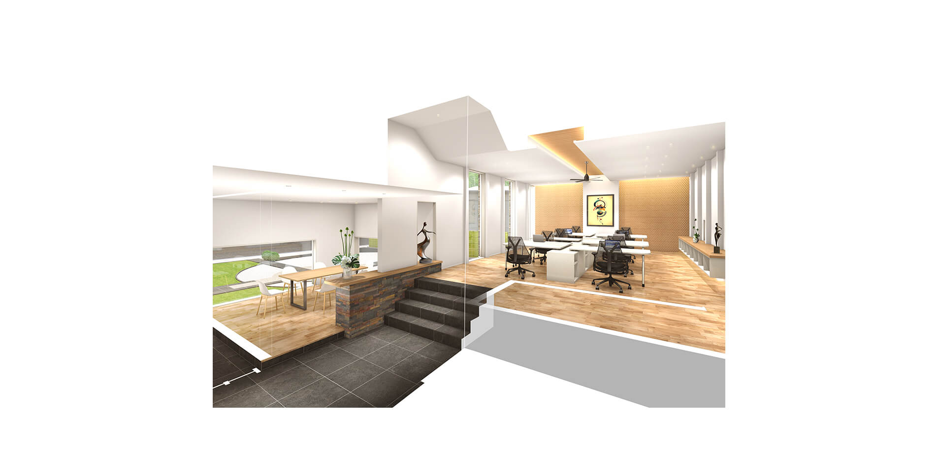 仕事の緊張感とリラックス感を融合させた空間をイメージした計画です。